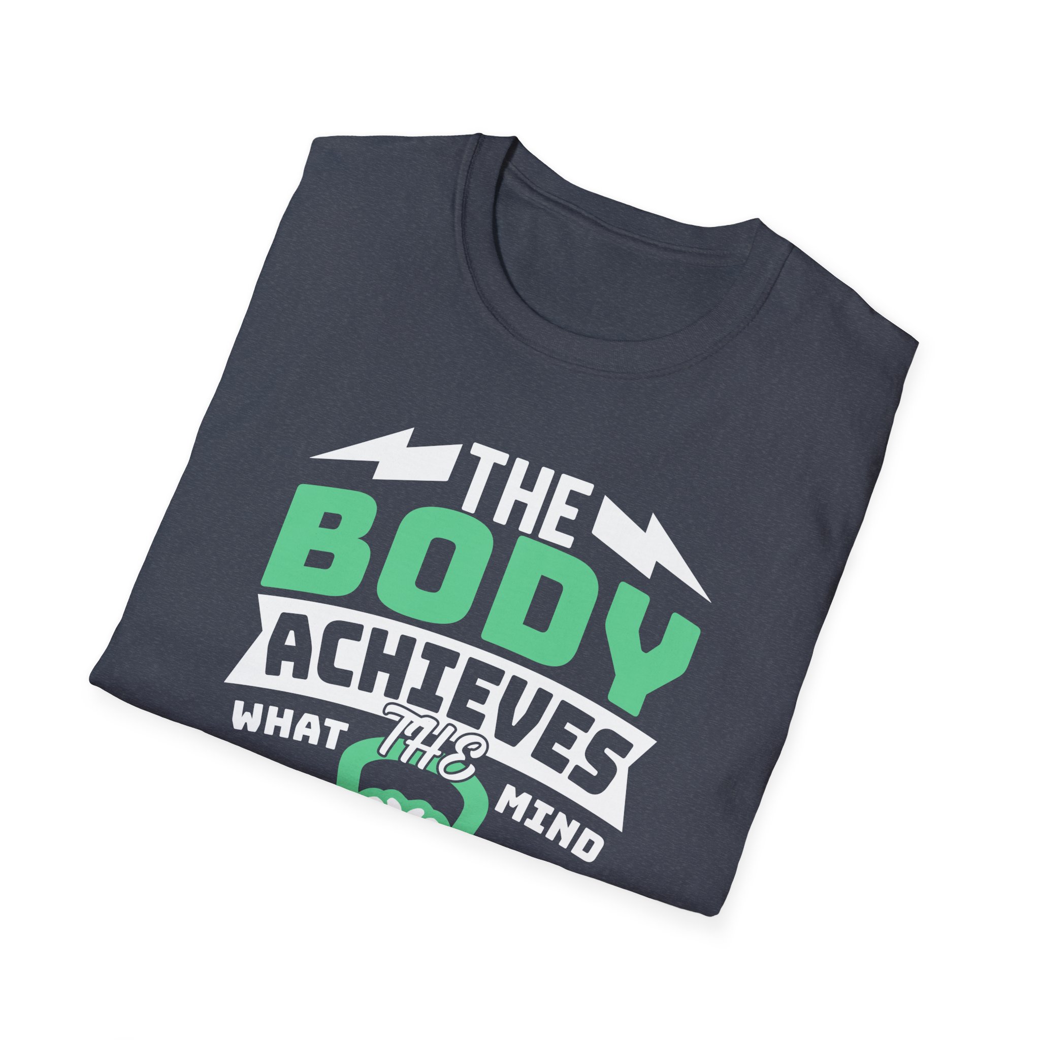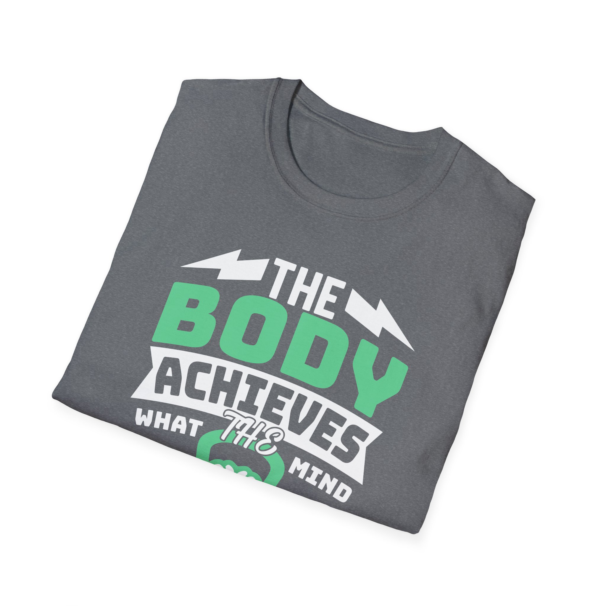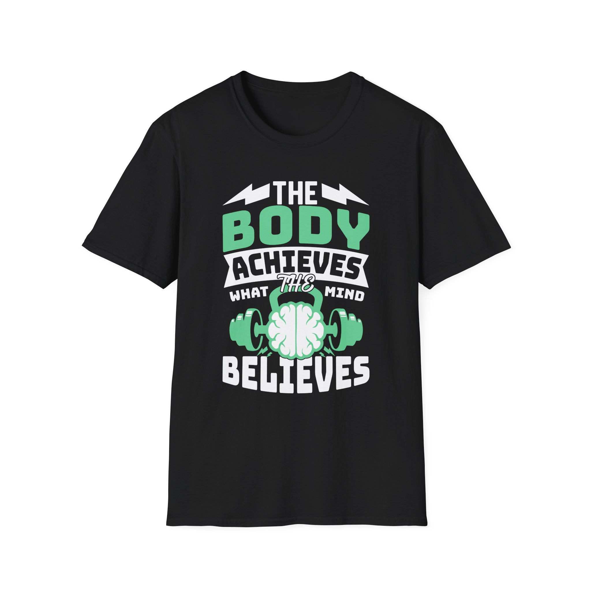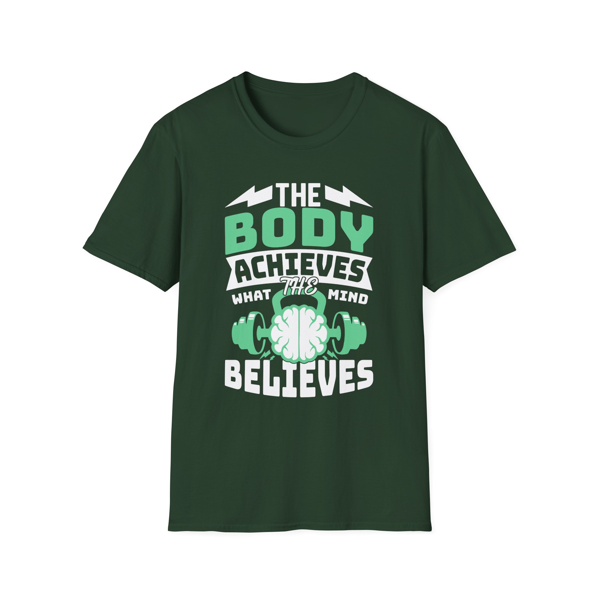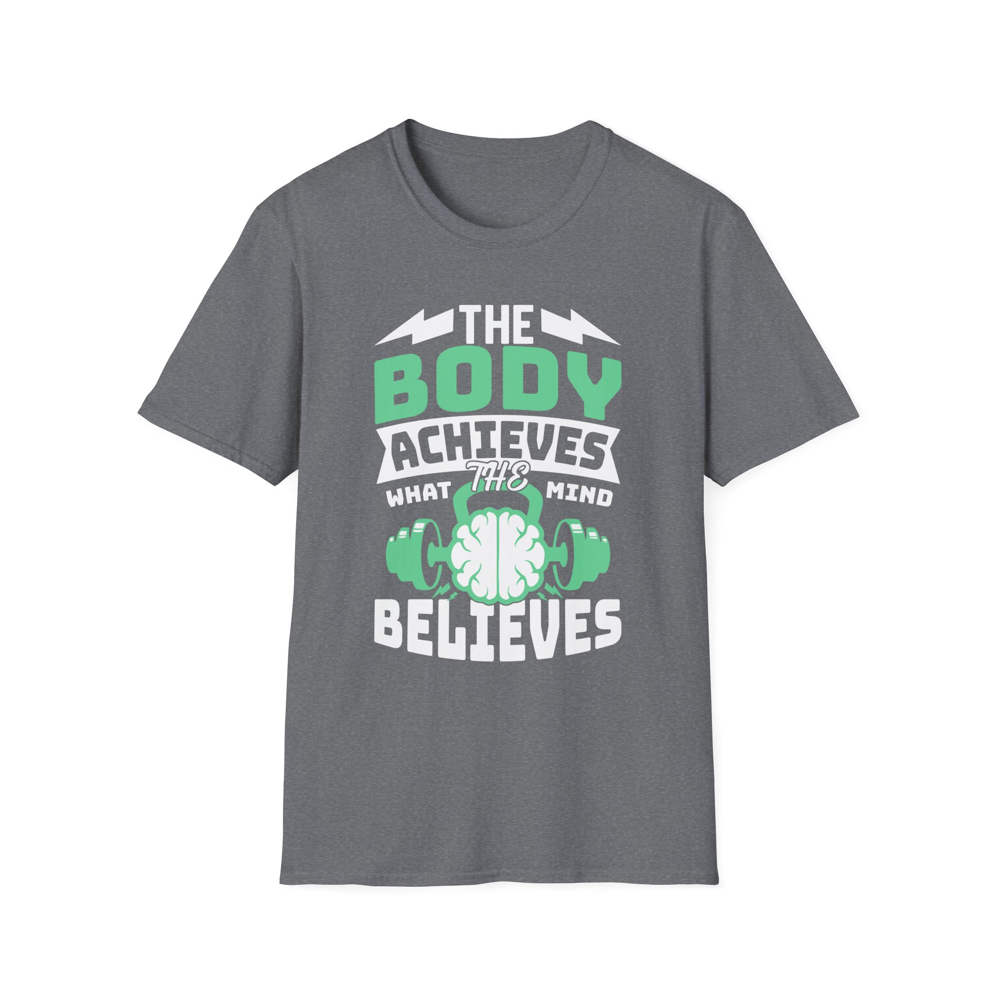 A clean, breathable tee that speaks to anyone who trains with intention. The bold front graphic — a stylized brain cradled by dumbbells with the phrase “The body achieves what the mind believes” — feels like a personal mantra you can wear to the gym, a run, or a weekend of focused recovery. The lightweight ring-spun cotton drapes naturally and keeps movement easy. Subtle design details (ribbed collar, tear-away label, and sturdy shoulder tape) mean this shirt wears well wash after wash, while ink-true printing methods keep the message sharp. Slip it on before a lifting session or put it on after a long run — it’s a quiet reminder to push, rest, and return stronger.
