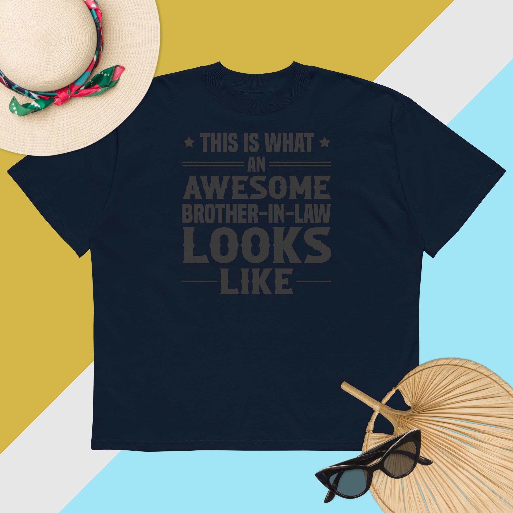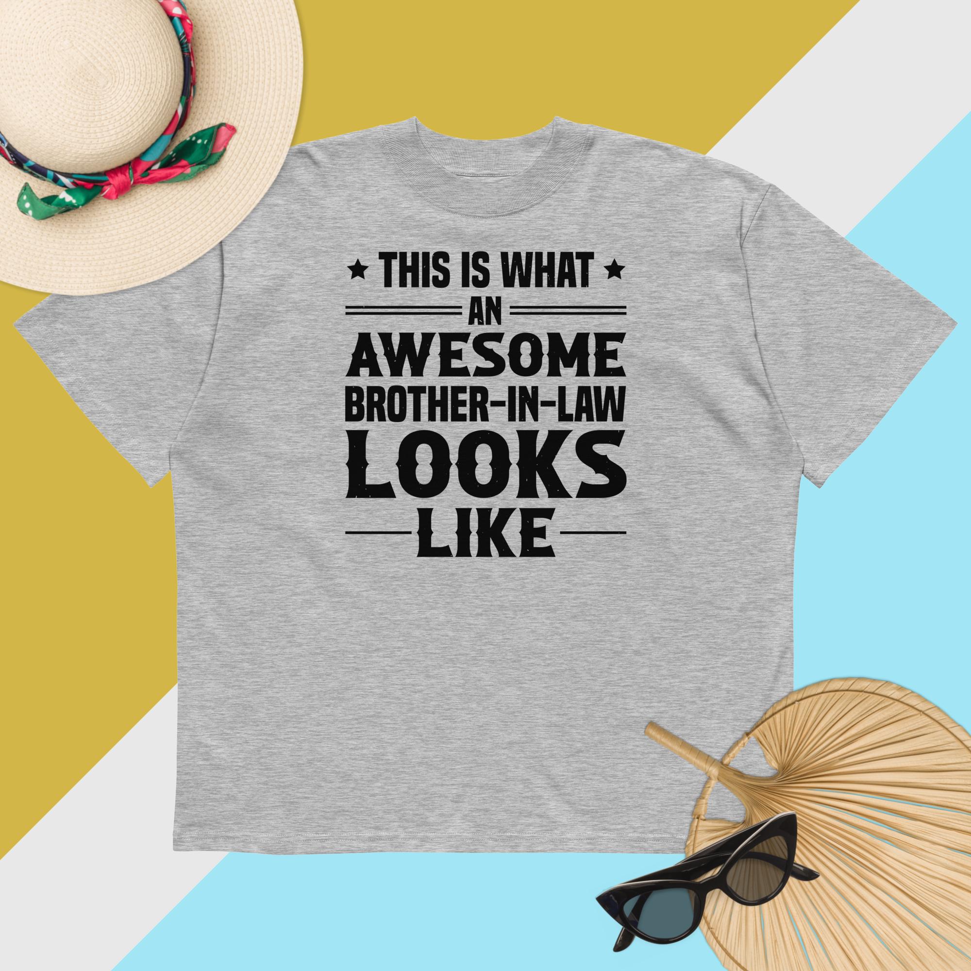 The front features a bold statement—“This is what an awesome brother-in-law looks like”—accented with eye-catching banner graphics and star elements that make the message pop. Whether he’s grilling, chilling, or winning “Best Brother-in-Law” of the year, this shirt brings a fun, heartfelt flair to any occasion.
